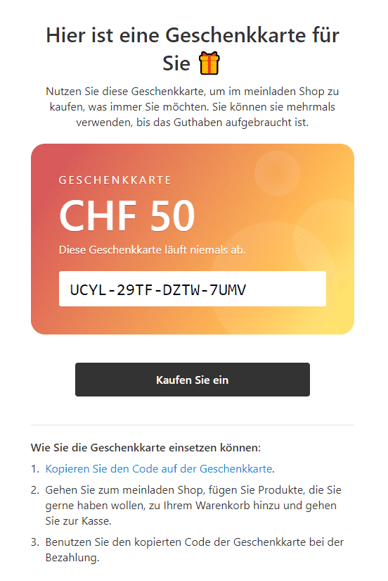 Nach dem Kauf erhält Ihr Kunde eine E-Mail mit einem eindeutigen Geschenkkartencode und Anweisungen zur Verwendung des Codes. Der Betreff der E-Mail lautet: "Ihre Geschenkgutschein ist fertig". Sie wird automatisch an die E-Mail-Adresse des Kunden gesendet, sobald die Bestellung den Status "Bezahlt" erhält.