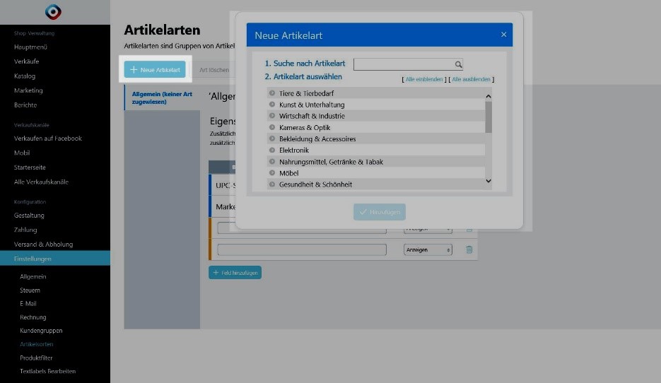 2. Klicken Sie auf +Neue Artikelart hinzufügen.