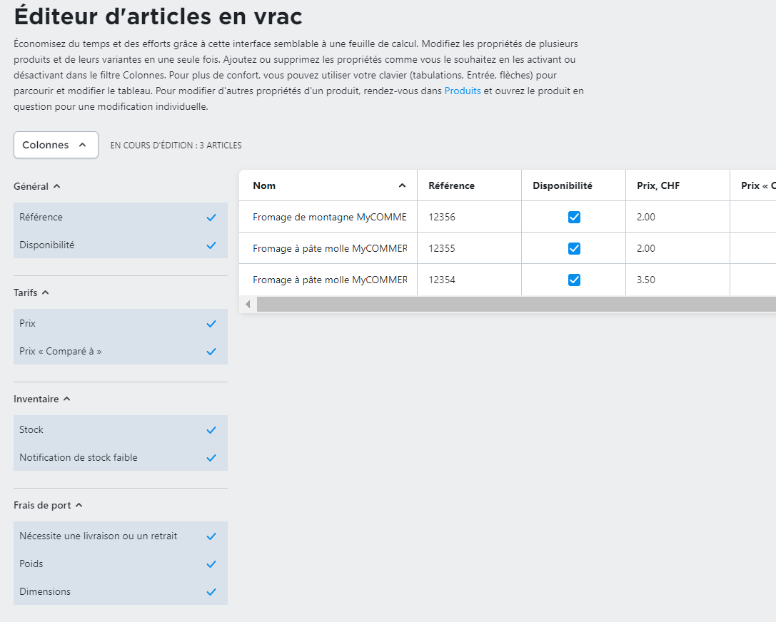 Vous pouvez utiliser l'Éditeur d'articles en vrac pour mettre à jour des produits de façon groupée dans votre boutique en ligne. Cet outil vous permet de modifier les propriétés de plusieurs produits, notamment le nom, l’UGS, le prix, la disponibilité, les paramètres d’expédition, etc. Vous pouvez également l’utiliser pour modifier les variantes de produits.