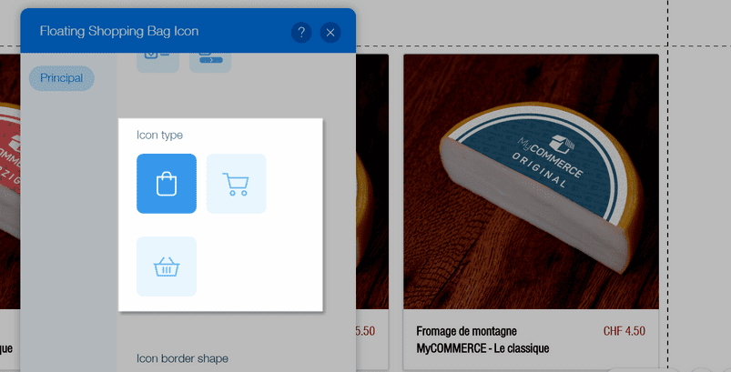 Dans l’application MyCOMMERCE pour Wix, vous pouvez choisir parmi deux symboles de panier:
