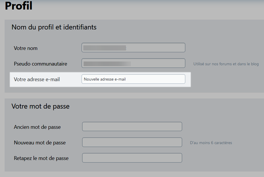2. Dans la section Nom du profil et identifiants, remplacez l’adresse e-mail du champ Votre adresse e-mail par celle que vous souhaitez utiliser: