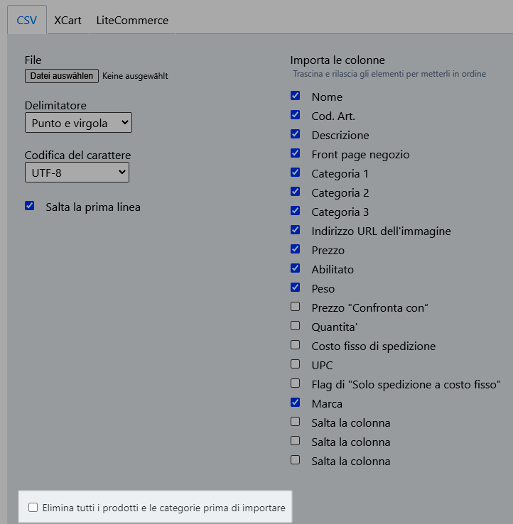 7. Attivi l’opzione Elimina tutti i prodotti e le categorie prima di importare se desidera cancellare il catalogo prima dell’importazione.