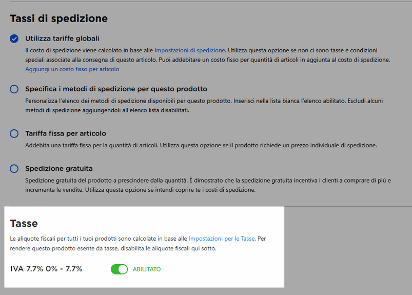 4. Scorra verso il basso fino a Tasse e abiliti le aliquote che devono valere per questo prodotto (o disabiliti tutte le aliquote, se si tratta di un prodotto/servizio non imponibile).
