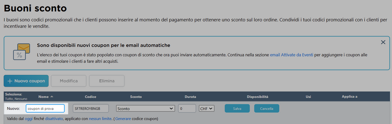 4. Inserisca un codice alfanumerico per il suo coupon o utilizzi il codice generato da MyCOMMERCE:
