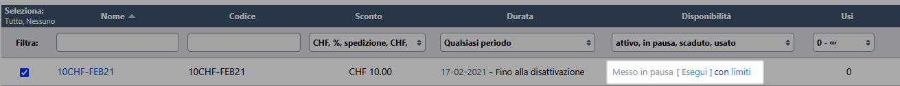 Consiglio: cliccando sul numero nella colonna Utilizzi, potrà visualizzare un elenco degli ordini effettuati con questo codice.
