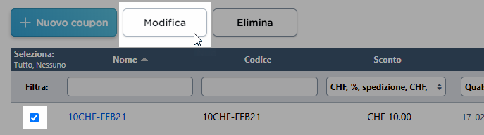 È possibile gestire i codici dei buoni sconto sul suo account MyCOMMERCE alla voce Marketing → Buoni sconto. Qui può filtrare i buoni per: