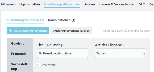 2. Wenn Sie möchten, dass Ihre Kunden zu jedem Artikel in der Bestellung einen Kommentar abgeben, können Sie Ausführungsalternativen verwenden. Die Kunden können ihre Kommentare zu jedem Produkt in der Bestellung hinterlassen, was sich auch auf der Bestelldetailseite widerspiegelt. Sie können die Ausführungvariante auf der Registerkarte Ausführungsalternativen in Ihrem MyCOMMERCE Konto → Katalog → Artikel, die Produktdetailseite, aktivieren. Klicken Sie auf die Option Neu, benennen Sie sie, wählen Sie Textfeld im Dropdown-Menü für den Eingabetyp. Aktivieren Sie die Option Pflichtfeld, wenn Sie möchten, dass sie obligatorisch ist, und speichern Sie die Änderungen: